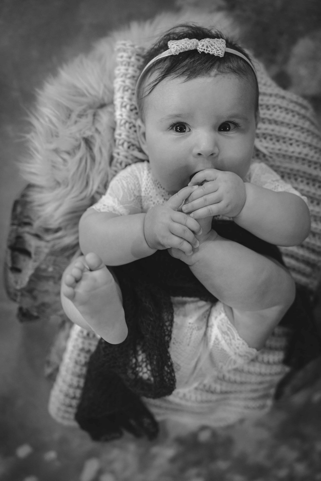 Das Baby wird zuerst in seiner Kleidung fotografiert, um in der Situation anzukommen. Je nach Absprache haben wir eine Auswahl an Kleidung dabei, in die wir dann gerne wechseln können.